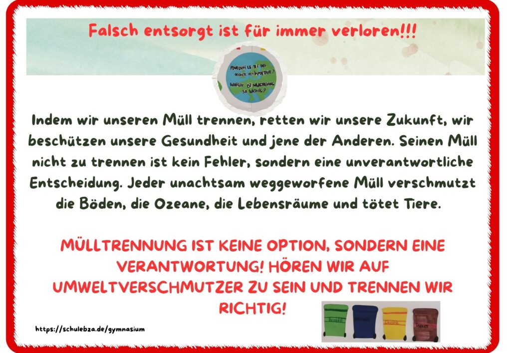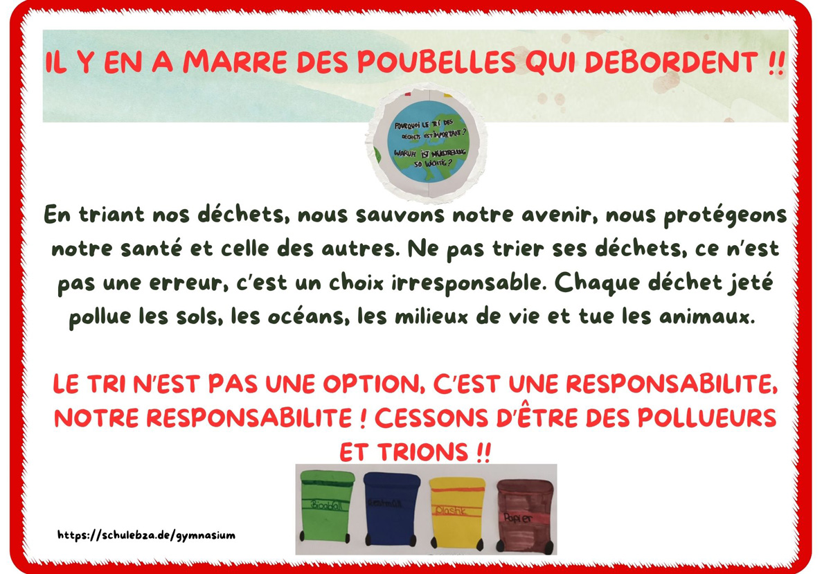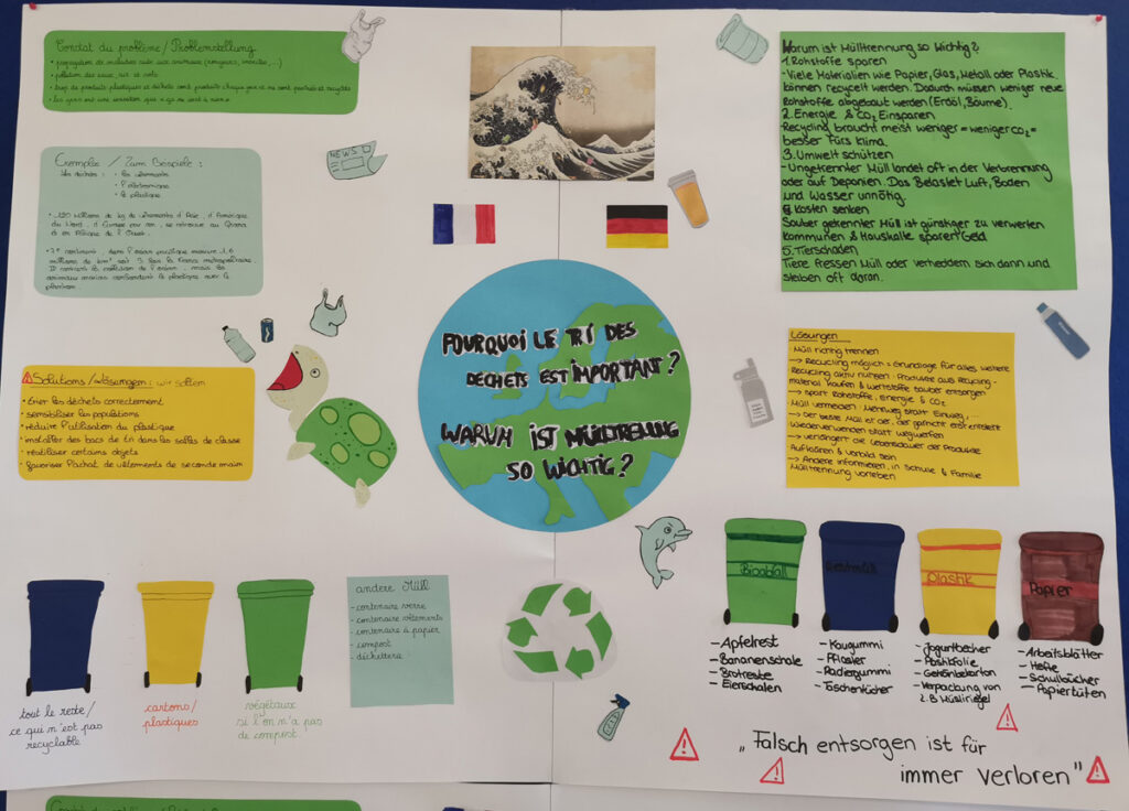 Wusstet ihr eigentlich, dass jedes Jahr Müll in der Menge von 2 Millionen Brandenburger Toren auf unserer Erde produziert wird? Das ist eine enorme Menge Müll, die leider größtenteils falsch entsorgt wird. Die Mülltrennung ist wichtiger, als ihr denkt! Um euch dieses Thema der Umwelt zuliebe näherzubringen, haben wir in Neustadt während der Drittortbegegnung gemeinsam mit einer französischen Schülergruppe ein Plakat für euch gestaltet. Wir erklären euch genauer, warum Mülltrennung extrem wichtig ist, zeigen euch die Folgen der falschen Entsorgung, bieten Lösungsvorschläge an und erklären auch noch einmal, wie das Ganze richtig funktioniert.