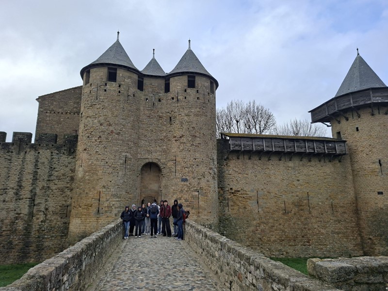 Nach erfolgreicher Projektarbeit sowie Präsentationen zu unserem Thema: „80 Jahre danach – 80 après: Regards croisés sur la Résistance française et le Widerstand allemand“ und einem sehr guten Kantinenessen ging es nachmittags zusammen mit den französischen Austauschpartnern mit dem Bus in die mittelalterliche Festungsstadt Carcassonne. In Carcassonne erhielten wir eine Führung –en français naturellement – durch die beindruckende mittelalterliche Festungsanlage und das Schloss. Auch wenn ein eisiger Wind durch die Altstadt fegte, war die Cité, die zum UNESCO-Weltkulturerbe zählt, auf jeden Fall einen Besuch wert !