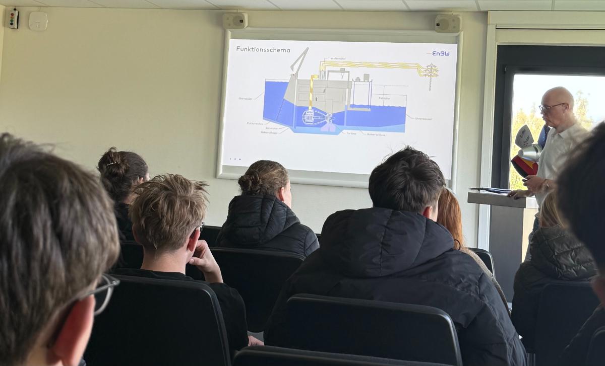 Zu Beginn hat Herr Volz einen sehr langen, aber auch informativen Vortrag über das Kraftwerk gehalten. Es ist das größte Laufwasserkraftwerk Deutschlands. Da es direkt an der französischen Grenze liegt gehört es sowohl der EnBW (Energie Baden-Württemberg) als auch der EDF (Électricité de France). Ein Laufwasserkraftwerk bietet – ebenso wie beispielsweise Pumpspeicherkraftwerke, Photovoltaikanlagen oder Windräder – die Möglichkeit, erneuerbare Energie zu gewinnen. Dies ist besonders wichtig, da Deutschland im Rahmen des Pariser Klimaabkommens eigene Klimaziele verfolgt und anstrebt, bis 2030 rund 80 % des Stromverbrauchs aus erneuerbaren Energien zu decken. Bis jetzt stammt in Deutschland 59% des erzeugten Stroms aus erneuerbaren Energien. Da es seit 2023 in Deutschland keine Kernkraftwerke mehr gibt und man dem Klimawandel entgegenwirken und die Abhängigkeit von anderen Ländern beenden möchte, wird immer mehr auf erneuerbare Energien gesetzt. Der Bau eines Laufwasserkraftwerks mag zwar sehr teuer sein, dafür sind diese jedoch auch sehr langlebig. Das Rheinkraftwerk Iffezheim besitzt fünf Turbinen zur Stromgewinnung. Die fünfte Turbine, die erst später als die anderen, nämlich 2013, gebaut wurde, ist größer als die anderen, dreht sich aber langsamer, was sie sicherer für die Fische im Rhein macht. Wir hatten sogar die Gelegenheit unter ihr und damit auch unter dem Rhein entlangzulaufen. Da das Rheinwasser immer eine unterschiedliche Höhe hat, sind jedoch nicht alle Turbinen immer aktiv. Dies war auch bei unserem Besuch der Fall. Aber was passiert mit den Fischen, die vom Oberrhein in den Unterrhein schwimmen und andersherum? Dafür gibt es eine sogenannte „Fischtreppe“. Bei der Besichtigung der Fischtreppe haben wir herausgefunden, dass Herr Braun der lang verloren geglaubte Sohn Poseidons ist und die Fische mit seinen übernatürlichen Kräften angezogen hat, sodass wir tatsächlich ein paar Fische sehen konnten!